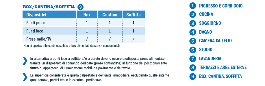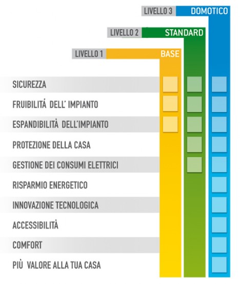 - oltre a un ulteriore aumento delle dotazioni, introduce la domotica a beneficio del risparmio energetico all’interno dell’abitazione. L’impianto per essere considerato domotico deve gestire almeno quattro funzioni domotiche, tra cui: anti-intrusione, controllo carichi, gestione comando luci, gestione temperatura, gestione scenari, controllo remoto, sistema diffusione sonora, rilevazione incendio, sistema antiallagamento e/o rilevazione gas.